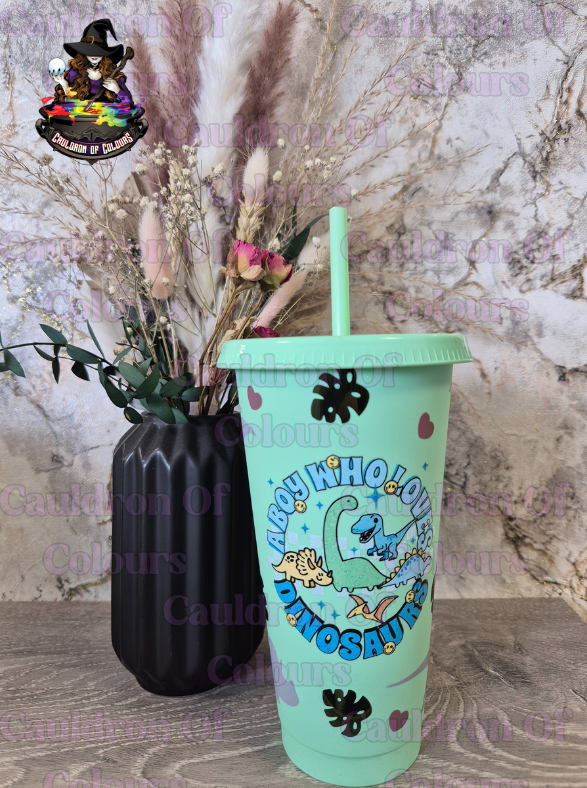 Roar into refreshment with the A Boy Who Loves Dinosaurs Cold Cup! This 24oz full-wrap cup is covered in playful dinosaur and leafy designs, perfect for any young dino enthusiast.