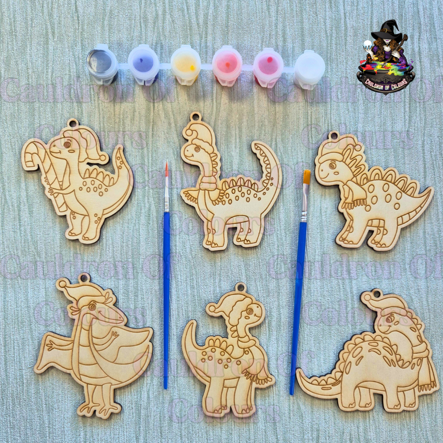 This kit features six assorted Christmas dinosaur pieces made from 3mm basswood, laser cut and engraved in our office. You can purchase just the six wood pieces for £10, or opt for the bundle that includes six pieces of wood, two paintbrushes, and six small pots of paint for just £12! The colours of the paint may vary, but I will keep the colours as seasonal as I can.