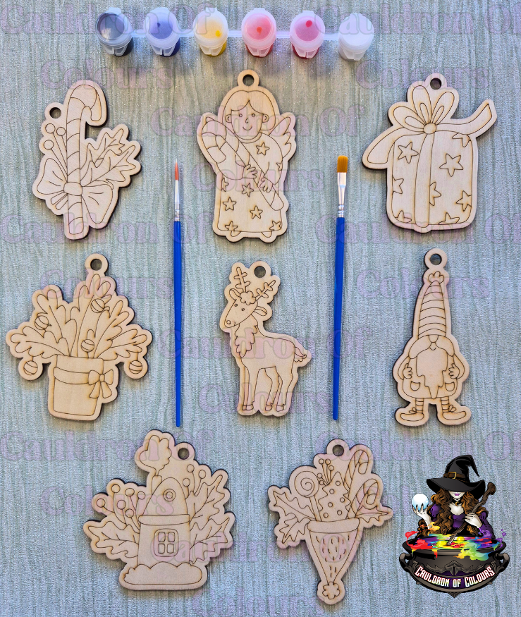 This kit features eight assorted Christmas pieces made from 3mm basswood, laser cut and engraved in our office. You can purchase just the eight wood pieces for £12, or opt for the bundle that includes six pieces of wood, two paintbrushes, and six small pots of acrylic paint for just £15! The colours of the paint may vary, but I will keep the colours as seasonal as I can.