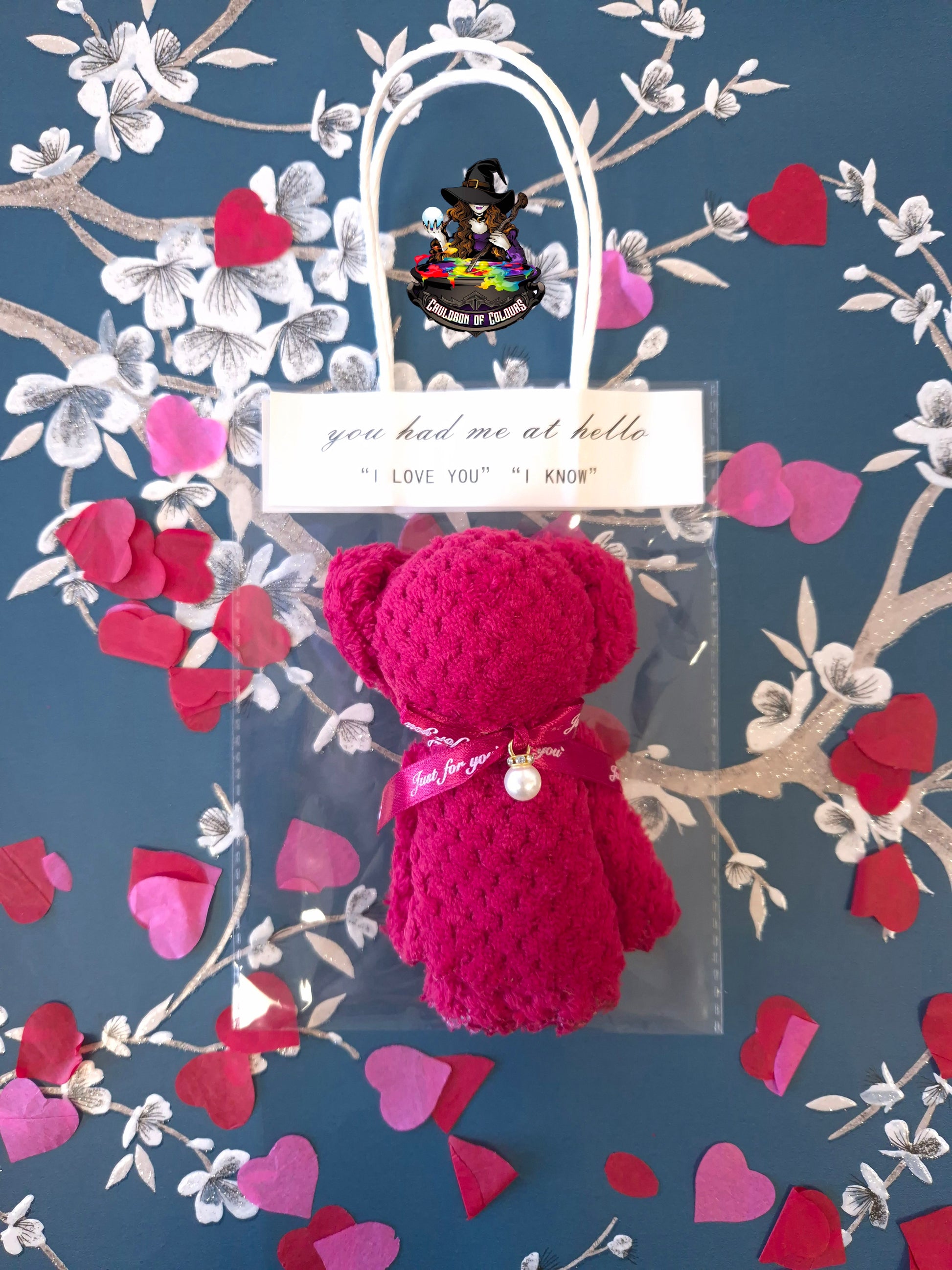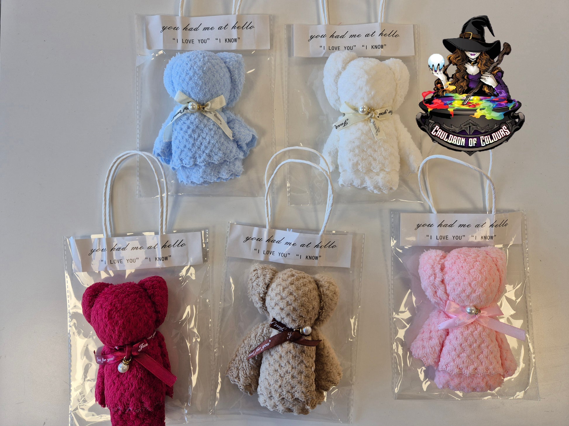 This adorable Towel Teddy Bear is the perfect gift for your significant other! Made out of soft and fluffy polyester material, it's shaped like a teddy bear and comes with a charming little bow. It's perfect for Valentine's Day or anniversaries, and comes in a little plastic bag.
