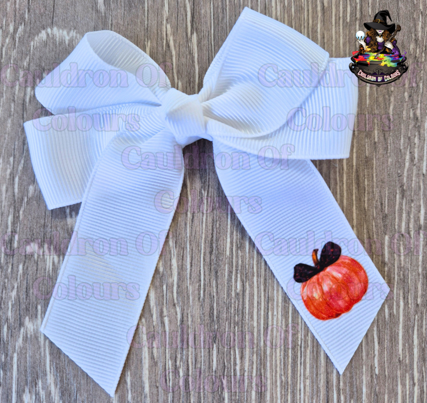 Add a touch of fun with these White 4" Bows featuring playful orange pumpkins. Made from durable grosgrain ribbon and 100% polyester, they hold their shape beautifully. Each bow comes with a handy crocodile clip for easy attachment. Sold as a convenient 2-pack, they’re perfect for adding a charming Halloween twist to any outfit or accessory.