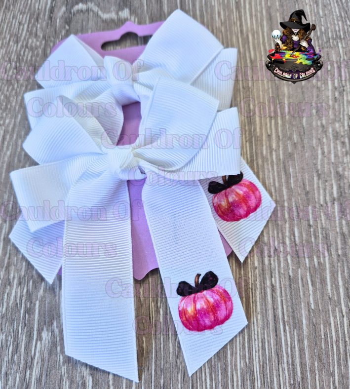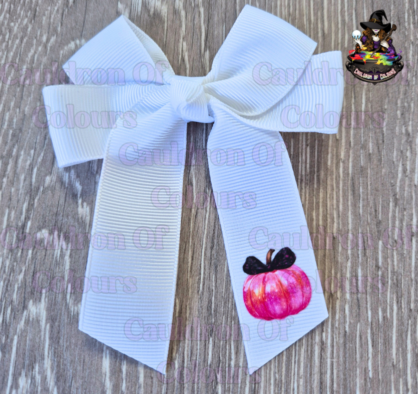 Add a touch of fun with these White 4" Bows featuring playful pink pumpkins. Made from durable grosgrain ribbon and 100% polyester, they hold their shape beautifully. Each bow comes with a handy crocodile clip for easy attachment. Sold as a convenient 2-pack, they’re perfect for adding a charming Halloween twist to any outfit or accessory.